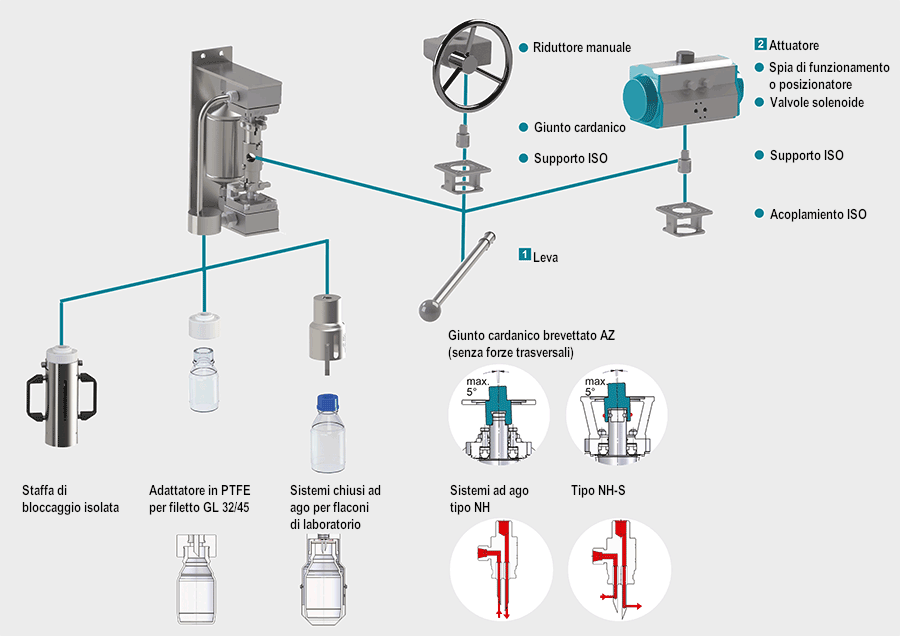 - Sistema ad aghi: per bottiglie da laboratorio con membrana (in Butile e PTFE) Sistema da aghi NH e NH-S con diversi diametri interni (2-6 mm). Per processi aggressivi, in presenza di rischio di esalazioni tossiche e per campionamenti in sicurezza privi di perdite.